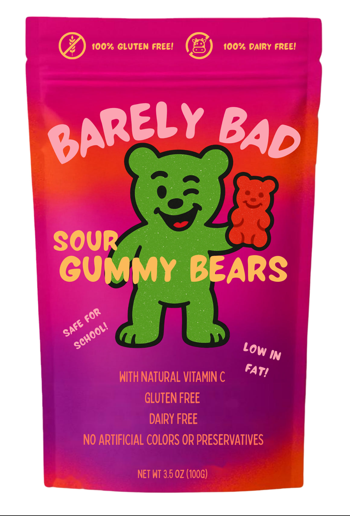 Hi, I’m the founder of Barely Bad — and I’m someone who really misses snacks.When I was diagnosed with gluten and dairy intolerances, it felt like my favorite foods vanished overnight. Gummy bears, sour candies, snacks that actually tasted fun? Gone. And every “healthy” alternative I tried was either packed with weird additives or tasted like disappointment.That’s when I decided to flip the script.Barely Bad was born out of rebellion. A playful protest against boring health food and sugar-loaded junk. I set out to create a sour gummy bear that was just as mouth-puckering and addictive as the ones I grew up with — but better for your body.No gluten. No Dairy. No preservatives. No artificial colours. Low in sugar, high in fibre, and made with all natural ingredients.The name? It’s a wink to what we stand for:✨ Barely Bad means indulgent without the guilt. Clean ingredients with dirty intentions. Health-forward with a mischievous twist.This isn’t just candy — it’s a comeback. A way to reclaim the foods I used to love, and share them with anyone who’s ever felt left out because of what they can’t eat.And Benny the Bear? He’s our cheeky mascot and your new partner in snackable crime. He’s not just a gummy — he’s a movement.Thanks for being part of the journey. Now let’s make bad candy history.